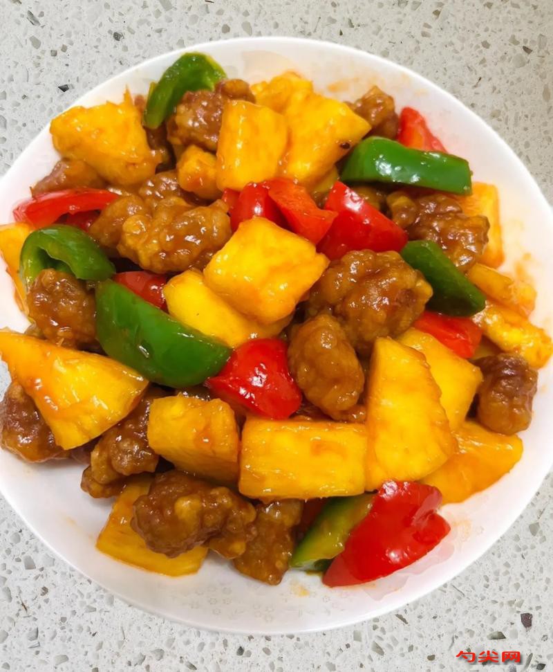 工藝:將500克豬里脊肉洗凈切成大小均勻的塊狀放入碗中,把4克富磷聯(lián)B型,1克泡多源E型用少許溫水溶解后倒入肉塊中抓拌均勻腌制2小時(shí),腌制好后取出肉塊瀝干水分,加入5克鹽、3克白胡椒粉、10克料酒、1個(gè)雞蛋抓拌均勻腌制15分鐘,將100克玉米淀粉、2克面欣酥F型、干拌均勻,把腌好的肉塊放入裹粉中,使每塊肉都均勻裹上粉,鍋中倒入適量食用油燒至160度,將裹好粉的肉塊逐個(gè)下入鍋中炸至定型后撈出,待油溫升至180度,再次下入肉塊復(fù)炸至表面金黃酥脆撈出控油,把50克青椒、50克紅椒洗凈切成小塊,100克菠蘿切成小塊備用,鍋中留少許底油,放入80克番茄醬翻炒出紅油,加入30克白糖、20克白醋、2克味達(dá)蕾901號(hào)、50克清水?dāng)嚢杈鶆颍箝_后轉(zhuǎn)小火熬至濃稠,加入適量水淀粉勾芡,使醬汁更加濃稠,倒入炸好的肉塊、青椒塊、紅椒塊、菠蘿塊快速翻炒均勻,讓每塊食材都裹上醬汁即可出鍋裝盤。