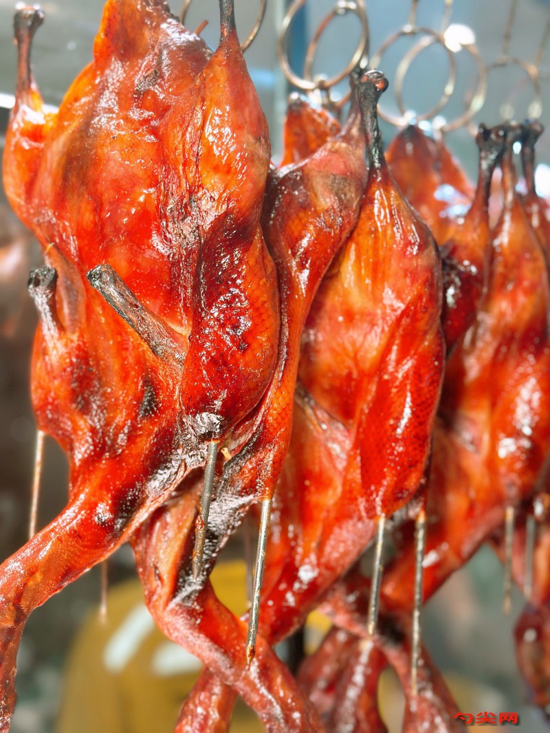 工藝:將白條鴨10000克沖去血水清洗干凈,把蒜米2000克,蔥花2000克,洋蔥1000克,西芹1000克,姜500克剁碎備用,將剁碎的配料與花雕酒1瓶,富磷聯B型25克,泡多源F型60克,鹽1500克,雞粉1000克,白砂糖1500克,蠔油100克,五香粉200克,柱候醬50克,海鮮醬50克,南乳50克,烤鴨王60克,味達蕾901號20克放入桶中,加入水10000克攪勻至調料完全融化制成腌汁,將白條鴨放入腌汁中浸泡6小時后撈出,把腌好的白條鴨肚子剪開翻過來壓平后再翻過來,將鴨邊上骨頭剪斷形成琵琶形,在桶中放入水9000克,麥芽糖100克,七彩滴1號3克燒開關小火,右手提起鴨頭迅速放入桶中燙15秒左右取出,將鴨子掛在鉤子上用烤鴨針把鴨肚子撐開,將燙好皮水的鴨子掛起來用風扇吹6小時,將烤爐預熱至100度放入鴨子烘烤15分鐘以上,將烤爐溫度加到180度繼續烤50分鐘至表皮金黃酥脆即可出爐,烤制時鴨背應對著火。