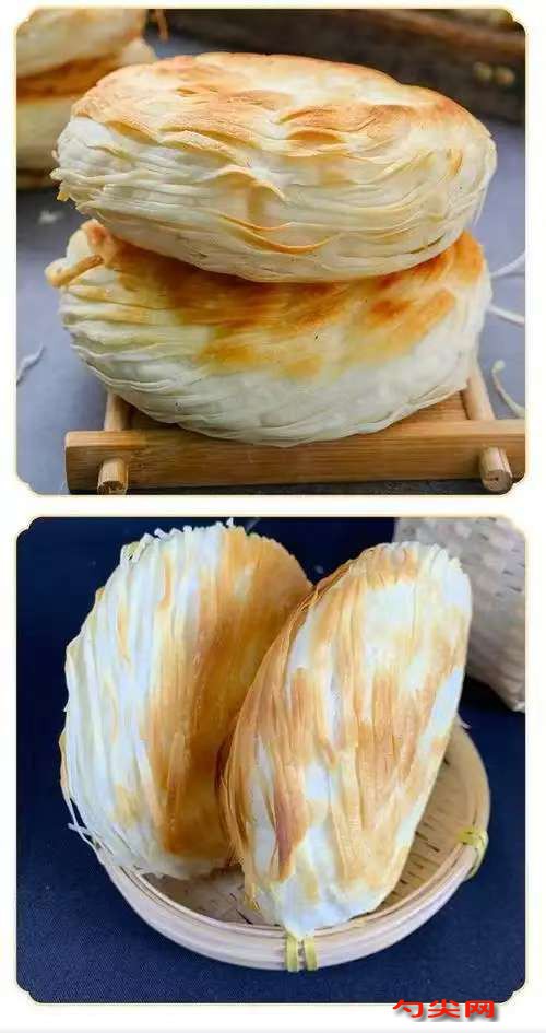 工藝:稱取面粉500克,面欣酥A型4克干拌均勻,稱取常溫水230克加鹽3克,豬油20克,水分多次加入邊加邊攪拌成面絮,活成面團覆蓋保鮮膜松弛10分鐘,松弛后揉光面團再次覆蓋保鮮膜醒面30分鐘,醒好的面用壓面機反復壓光至表面光滑,壓成約1毫米厚面片,表面撒面粉后翻面再撒面粉,刷一層豬油后邊抻邊卷緊實,剩余1/4處用滑絲器拉至末端,去掉兩頭多余面,再次刷豬油后邊卷邊抻至1/2處,收口去除多余面頭后卷緊搓勻,下劑時左手轉右手捏,邊轉邊按緊實,掐斷收口捏緊捏小放內部防止漏氣,頂部做成圓錐形制成餅胚,餅胚尖朝上用手掌心順時針按平,反面用搟面杖搟成0.3厘米圓片,放入電餅鐺先烙背面至上花后刷豬油翻面烙至金黃色,轉入烤箱正面朝上烤4分鐘至金黃酥脆。