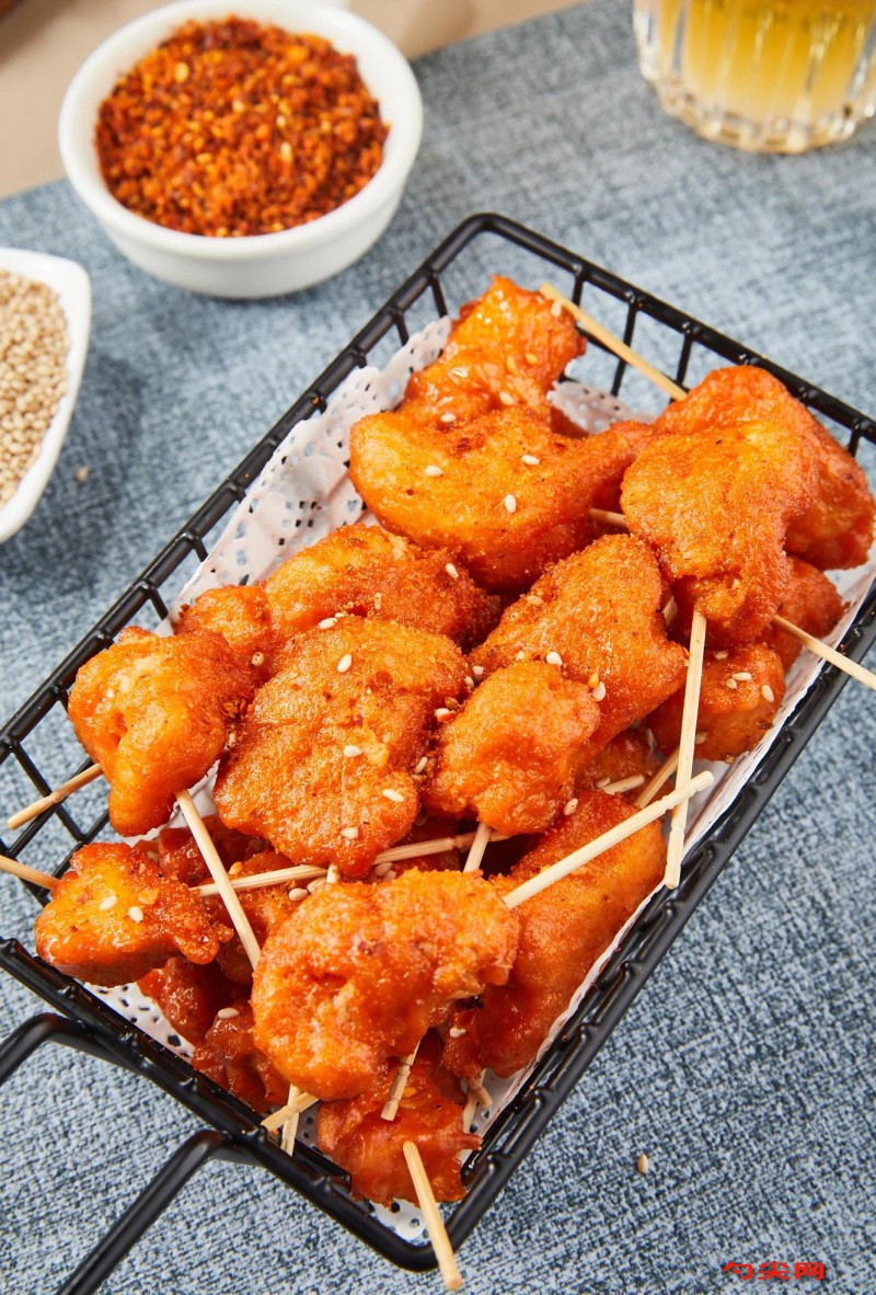 工藝:將洗凈切好不規(guī)則小方形的1000克豬肉塊放入盆中,加1000克水,把8克富磷聯(lián)B型用溫水溶解后加入,浸泡腌制8小時(shí),將20克泡多源E型用溫水溶解,直接加入,攪拌均勻,腌制好的肉塊取出瀝干表面水分,稱取4克味達(dá)蕾901號(hào)與20克鹽拌勻,加入20克料酒、20克生抽、20克蠔油、30克蔥段、20克姜片抓拌均勻,加入100克淀粉,打入2個(gè)雞蛋抓拌均勻,加入少許清水調(diào)成粘稠狀腌制30分鐘,用竹簽把腌好的豬肉塊一塊一塊穿起來(lái)擺入盤子中,全部穿好后準(zhǔn)備油炸,油溫160度將牙簽肉一塊一塊下入鍋中,下鍋后先不要攪動(dòng),炸定型以后撈出,油溫170度再次下鍋輕輕攪動(dòng),炸至金黃酥脆、膨松飽滿撈出,趁熱撒上少許孜然芝麻、辣椒粉即可銷售。