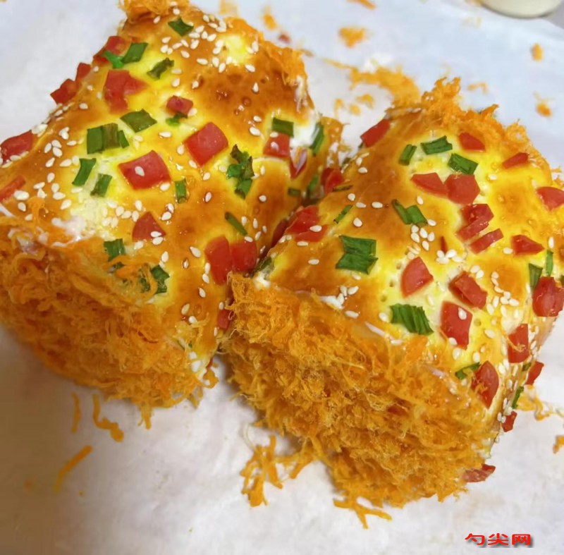工藝:活面機中倒入高筋粉、佳多美Q型、白砂糖、鹽、酵母、雞蛋、牛奶,再加入用涼開水溶解好的美久亭Q型,用慢速攪拌至無干粉,再開快速打到面團出現厚的手套膜。加入軟化好的黃油,用慢速攪拌至面團與黃油充分融合。把面團放在盆中,蓋上保鮮膜,放醒發箱醒發至出現蜂窩狀。取出面團輕拍排氣,分成劑子,搟成牛舌狀,放一塊火腿片,卷起來劃兩刀,再立起來放入紙杯中。將面包生坯醒發至兩倍大,刷上雞蛋黃,撒點芝麻,再來點用雞蛋液浸泡過的香蔥。烤箱提前預熱,上火200下火200,烤13分鐘,烤好后出爐。面包放涼后,從中間切開,不要切斷,把中間和表面擠上適量的沙拉醬,把表面的沙拉醬涂抹均勻,鋪上一層肉松。