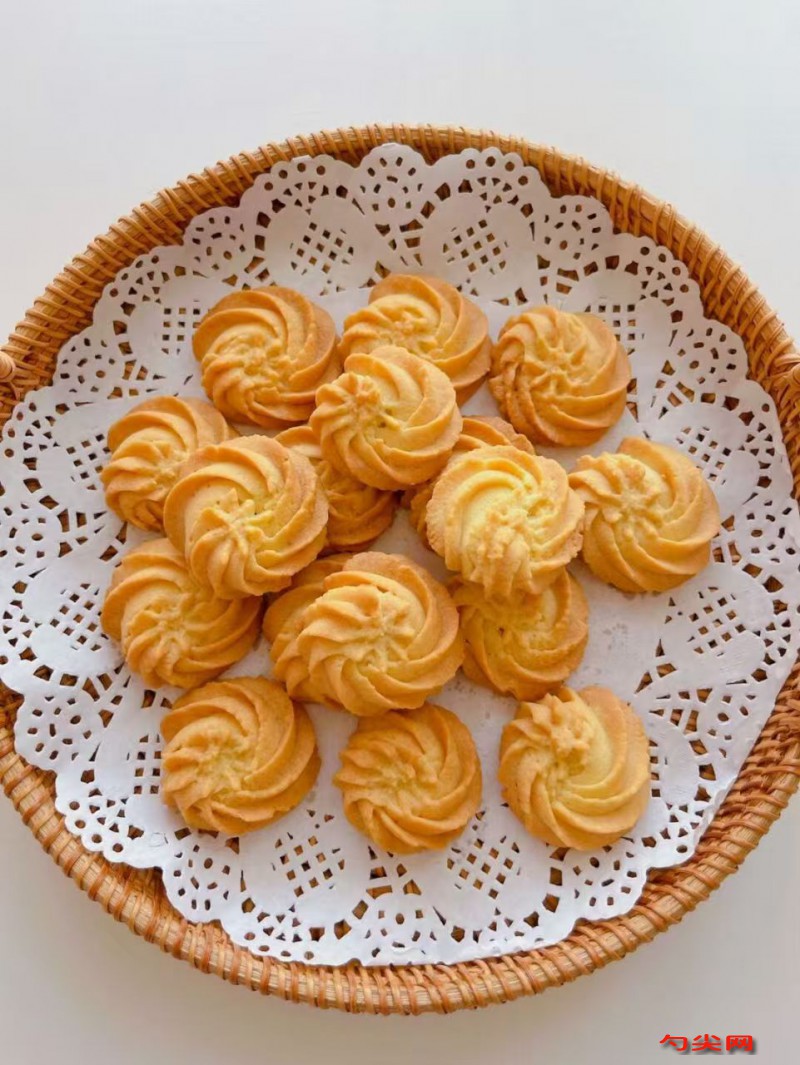 注意事項:黃油軟化需到位但不可熔化,否則會導致花紋塌陷,冬季可用微波爐解凍檔加熱10秒輔助軟化。擠花時裱花嘴與烤盤保持1cm距離,快速勻速擠出可避免花紋模糊。出爐后晾涼再密封,潮濕環境易使餅干變軟,可放入食品干燥劑延長脆度。