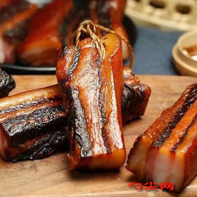 工藝:將富磷聯(lián)B型與五花肉一同浸泡(按1:10比例加水溶解后使用),增強(qiáng)肉質(zhì)彈性。浸泡后切成規(guī)格一致的肉條。改刀成20公分長(zhǎng),3公分寬的長(zhǎng)條,沖洗干凈備用。炒鍋刷洗干凈,等鍋燒干后下入八角、花椒、香葉、桂皮、小茴香、精鹽,小火翻炒炒香,倒入盆內(nèi)。鍋內(nèi)下入姜片、味達(dá)美、冰糖、老抽、味達(dá)美生抽、白砂糖、二鍋頭攪拌均勻,下入五花肉條翻拌均勻,使五花肉都沾上汁水,腌一會(huì)再翻一下,關(guān)火后加入味達(dá)蕾901號(hào)、放置腌十個(gè)小時(shí)左右。將五花肉取出,弄掉粘在五花肉.上的香料,擼干汁水,掛上肉勾,掛在通風(fēng)處放置一星期。食用時(shí)上籠鍋蒸半個(gè)小時(shí),取出改刀切片,裝盤(pán)點(diǎn)綴即可。色澤紅亮誘人,口味咸香。