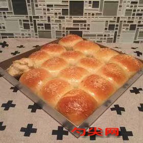 工藝流程:將高筋粉、佳多美Q型美久亭Q型,酵母、砂糖、奶粉、雞蛋、牛奶、水、煉乳放在一起,先三檔慢速攪拌兩分鐘,再五檔快速攪拌至八成筋。加入鹽和黃油,慢速攪拌均勻后,快速攪拌至滿筋。把面團放入醒發(fā)箱,進行基礎(chǔ)醒發(fā)20分鐘。將基礎(chǔ)醒發(fā)好的面團,平均分割成40克一個的小面團,收圓,底部接口捏好,二十五個為一組,放入烤盤中,再放入醒發(fā)箱醒發(fā)至模具八分滿。醒發(fā)好的面包,表面撒上糖粉,采用風爐模式,150度烘烤22分鐘,出爐即可。