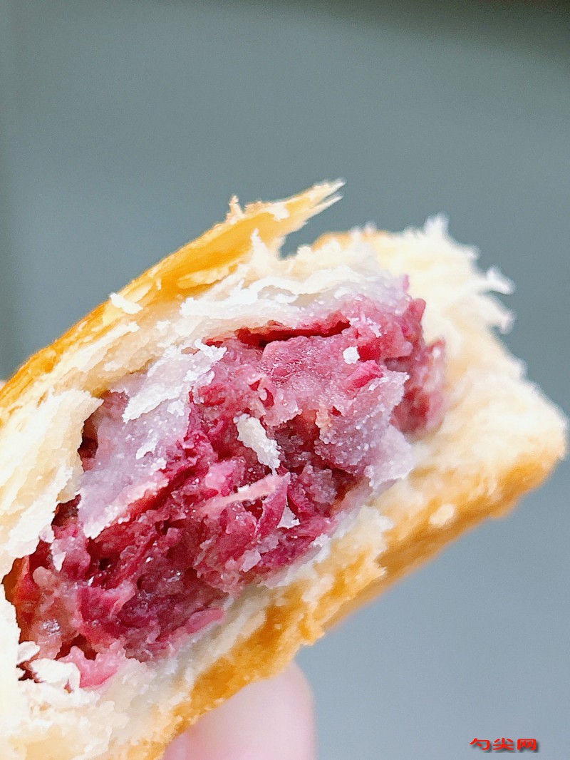 工藝:將200克面粉與4克面欣酥E型干拌均勻,取90克溫水加入25克白糖和溶解好的0.2克美久亭Q型攪拌溶解后倒入面粉中攪拌成面絮,加入50克液體起酥油揉成光滑水面團蓋保鮮膜醒面20分鐘,取120克面粉加入60克液體起酥油揉合成油酥面備用,將兩個面團搓成長條分割成均等小面劑并團成圓球,取水面團壓出小窩放入油酥面用虎口收攏法包裹嚴實,搟成牛舌狀小餅從上向下卷起后取第一個面劑再次搟成牛舌狀小餅并卷起,取面劑從兩邊向中間壓扁搟成圓餅包入玫瑰鮮花餡按扁成生胚,將生胚放入鋪吸油紙的烤盤,烤箱預熱至上下火200度后放入烤制15分鐘至表面金黃即可出爐。