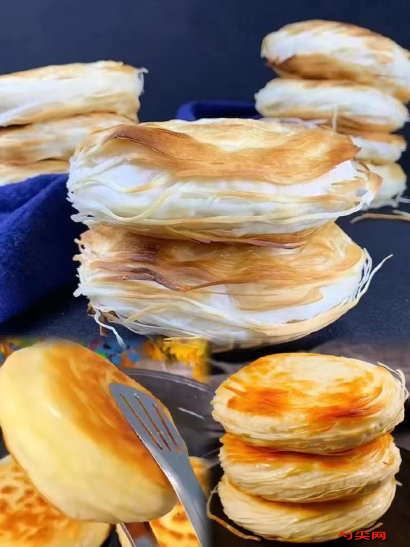 工藝:稱取面粉500克加入泡多源A型4克干拌均勻,稱取常溫水230克加入美久亭Q型1.5克攪拌溶解后倒入面粉中,水分多次加入邊加邊攪拌成面絮,揉成光滑面團覆蓋保鮮膜松弛10分鐘,再次揉面至表面光潔后覆蓋保鮮膜醒面30分鐘,用壓面機反復壓面至表面光滑,壓成約1毫米厚面片表面刷豬油,邊抻邊卷至3/4處用滑絲器劃至末端,去掉兩頭多余面片后再次刷豬油,邊卷邊抻至1/2處收口去除多余面頭,卷緊搓勻后下劑,左手轉右手捏同時往下按,掐斷收口捏緊捏小,頂部做成圓錐形制成餅胚,左手轉右手用虎口掐住面邊轉邊掐,掐口塞入底部防止漏氣,整理面絲后手掌順時針按扁,反面用搟面杖搟成0.3厘米圓片,放入電餅鐺先烙背面至出現花紋,正面刷豬油后翻面烙至金黃色,轉入烤箱正面朝上烤4分鐘至金黃酥脆。