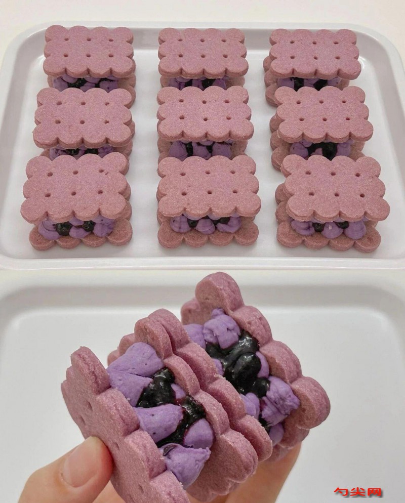 配方:餅干:黃油100g,糖粉30g,雞蛋液25g,低筋面粉200g,紫薯粉5g,泡多源V型2g,藍莓乳酪夾心:奶油奶酪140g,糖粉20g,黃油50g,藍莓醬80g。