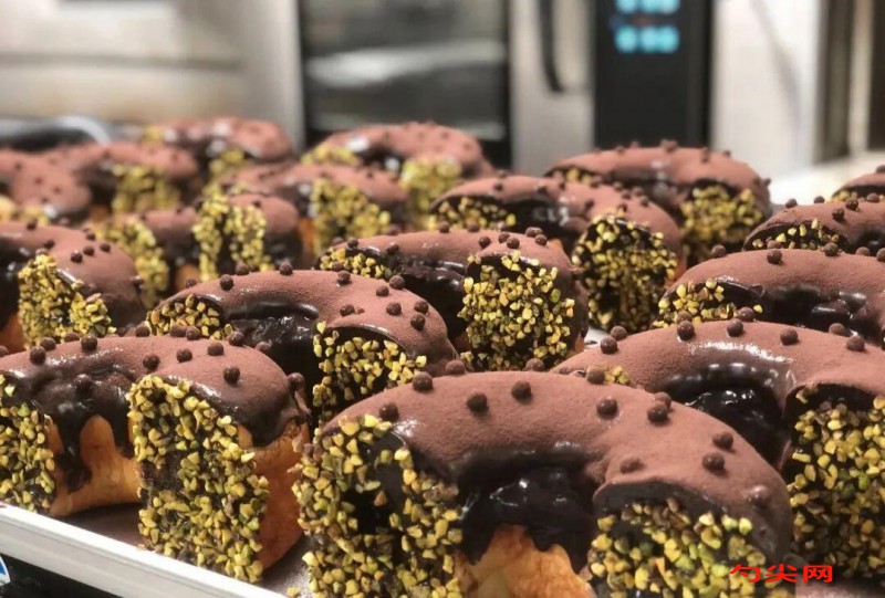 20分鐘左右即可,脫模晾涼。8、晾涼的面包多半切開,表面沾上融化的純脂黑巧克力,均勻的撒上黑巧克力脆米球待其凝固。9、切開處抹開心果乳酪醬,沾上開心果碎擺盤,篩上一層可可粉裝飾即可。