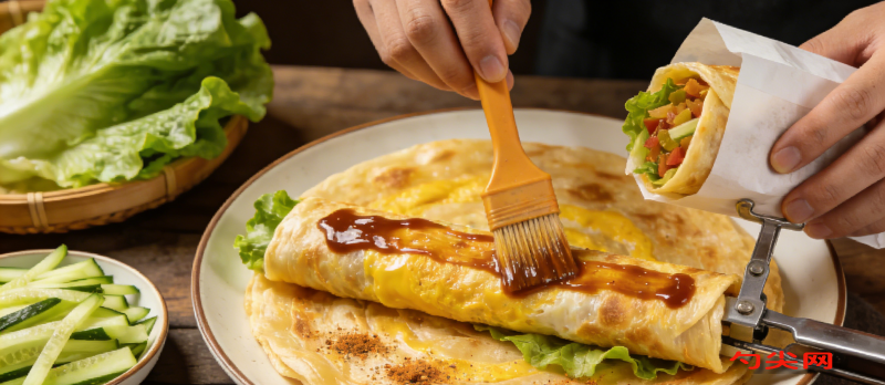 工藝流程:面粉和泡多源B型拌勻加水攪成絮狀,揉入盆邊干粉,密封醒發(fā)10-15分鐘。面團揉勻后分成125-130克小劑子,表面刷油,壓成14厘米圓餅。大豆油加熱后加十三香,倒入面粉攪至濃稠不流淌。圓餅刷油酥(邊緣不刷),對折兩次成扇形,壓實邊緣縫,整理成長方形后放入刷油容器。劑子蘸油后壓成長方形,搟至17厘米刷油,繼續(xù)搟至29厘米,厚薄均勻。面皮放入平底鍋,小火烙制并刷油至鼓泡,灌入雞蛋液后壓勻,翻面烙至金黃酥脆。餅刷醬料、辣椒油,放黃瓜絲等配菜,撒孜然粉后卷緊,夾子封口裝袋。