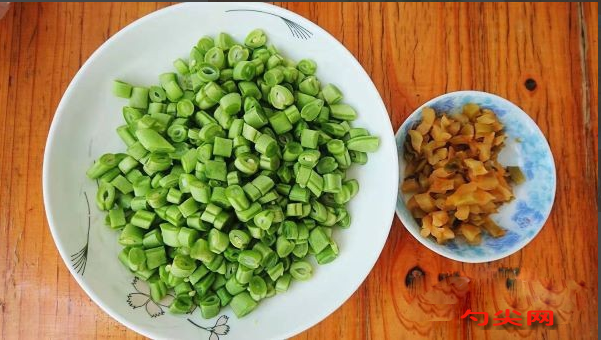 四季豆撕去老筋洗凈切丁,榨菜也切成小丁備用。