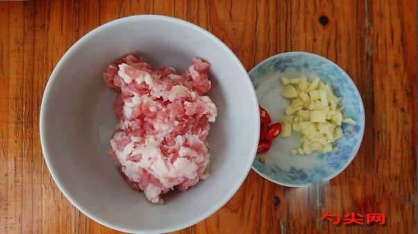 腿肉剁成肉末,蒜頭和小米辣均切好待用。