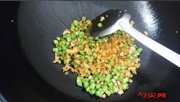 湯汁差不多收干的時候,放入榨菜丁翻炒兩下。