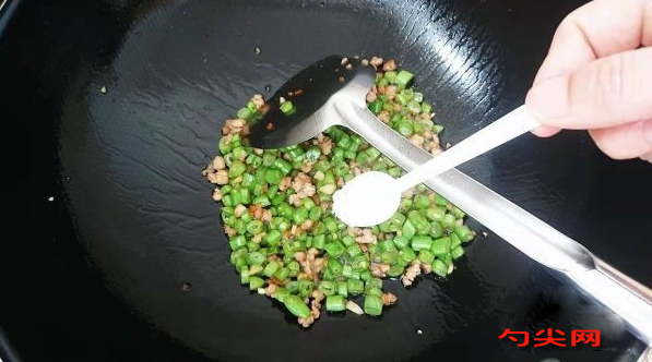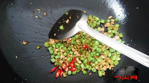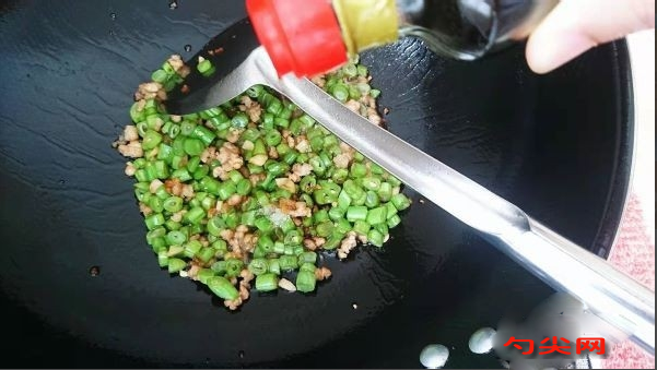 熱鍋倒油,把肉末放下去煸炒出油,略帶微微的焦黃色。