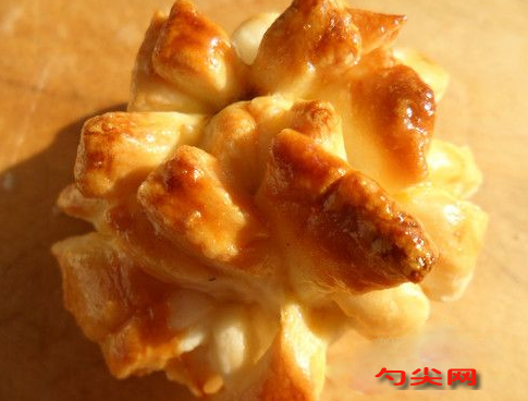 工藝:先按照小包酥的方法做好中式酥皮。將面欣酥加入和面水,加入面粉,拌勻再加入起酥油(提前加熱融化),和勻后靜止醒發1個小時。取一塊中式酥皮,搟成圓的薄皮,先用刀劃上四道口子,再分別劃上很多道口子,擠上豆沙餡,包起來。下面收口,上面的要像花瓣一樣散著。在花瓣上刷上一層全蛋液,放入預熱好的烤箱烤15分鐘左右。