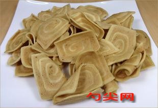 工藝:制作方法將面粉中放入白糖、生油、面欣酥B、凈蛋液,鹽和清水,攪拌溶化,搓成勻滑的黃色面團。用濕布封蓋,靜置10min。隨后,將面團壓成長方形面片,厚度為0.1cm,長為25cm,寬為20cm。在面皮表層涂一層橙紅色素水,迅速卷成一圓卷,卷口粘緊,將圓卷捏長,搓圓。搓至面卷的直徑2cm左右時,再切成2cm厚的薄片。將薄片攤開,灑上面粉以防黏結。炸鍋內放入油1000g,投入部分薄片,以中火浸炸,炸至露出深蛋黃色時,撈出瀝干油分,晾涼后即可。