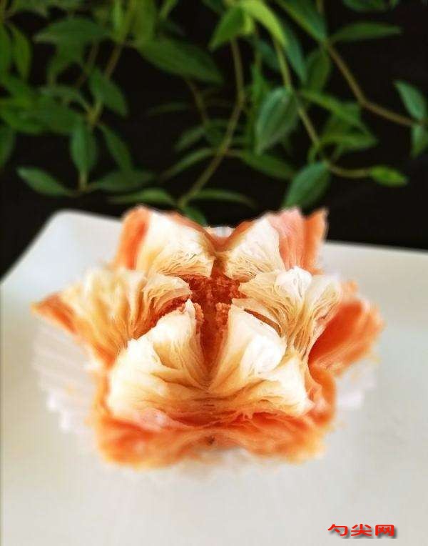 工藝:制作方法先將400g面粉、面欣酥E、食油,加溫水250g,揉勻后制成皮面,靜置5min。將豬油放入鍋中燒開后離火,倒入面粉80g,拌勻,冷卻。將皮面搓條揪成20個小劑;將油酥拌入椒鹽,搓勻后團成20個小劑。每個小劑壓扁包入一塊油酥劑,捏緊收口,壓扁,輕輕搟扁成長方形片,疊起再搟薄。照此法反復三次疊成方形劑,雙手捏住兩頭做成圓形生坯,表面用快刀將頂端交叉劃三刀,成六瓣,使層次露出,呈蓮花形。炸鍋中油溫達80℃時,將生坯逐個人鍋油炸,見花瓣張開撈出。