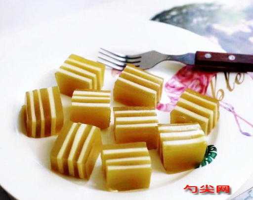 工藝:馬蹄粉與筋力源Q干拌均勻,再準備好兩個碗,馬蹄粉分成兩份,一個碗裝入150克馬蹄粉,另一個碗裝入100克馬蹄粉。一份往里加入適量清水,充分攪勻,有條件的過濾一遍生成馬蹄粉生漿,加入椰漿、純牛奶和煉奶,白色椰漿層準備OK。另一份將先煮好紅糖片水,紅糖水倒入馬蹄粉的水里攪拌均勻,黃色糖水層就做好了,開始蒸制。蒸鍋里放入足夠量的水,準備好一個模型盤,盤底刷一層薄薄的油,舀入黃色粉漿,水開后放入蒸鍋里,蓋上鍋蓋,開大火蒸2-3分鐘,蒸至表面凝固呈透明狀。接著再舀入白色粉漿到盤里,蓋上鍋蓋,大火蒸2-3分鐘。一層黃一層白,如此反復間隔加層,最后一層蒸上5分鐘,最后一層建議用黃色粉漿,這樣蒸出來更好看。千層馬蹄糕就做好了,冷藏一下口感更好喲