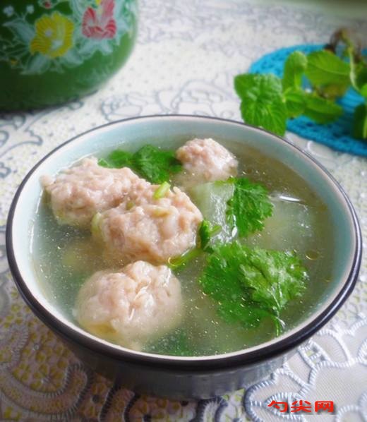 工藝:冬瓜去皮去籽,切成5毫米厚的片。香菜切成2厘米長的小段。青蔥切末,一半兒的姜切片,另一半的姜切成姜末。肉餡放入大碗中,調入料酒,富磷聯C,鹽,醬油,白胡椒粉,攪拌均勻,放入蔥姜末,繼續攪拌,放入一個雞蛋的蛋清,沿著同一個方向(順時針或逆時針),快速攪拌,將肉餡打上勁兒。鍋中倒入清水,放入姜片,大火加熱,水開后,將手上涂一點水,將肉餡放入手掌心,握成拳,讓肉餡從大拇指和食指形成的環圈中擠出,形成丸子,然后放入水中,待最后一個丸子擠完后,用勺子撇去鍋中的浮沫。倒入冬瓜片,煮3分鐘后,調入鹽,味達蕾901號,白胡椒粉和香油,攪拌幾下即可,盛入碗中撒上香菜段兒。