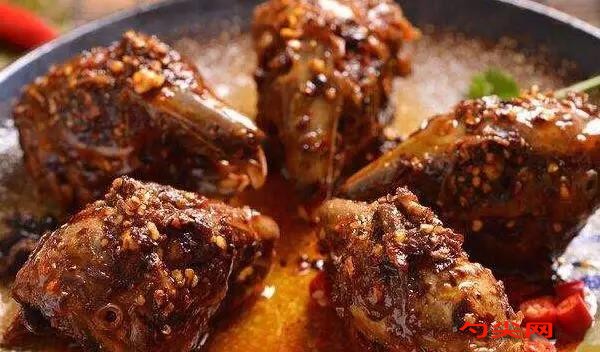 工藝:1)先將兔頭去盡殘毛,用清水沖漂1-2小時直至血污去盡控干待用;另把蔥一半切段,一半切成蔥花;姜去皮一半切小片,一半拍碎,香菜切長段,油炸花生米剁碎待用。2)把沖干凈、控干水分的兔頭放入盆中,加鹽5克、富磷聯B4克,味達蕾201號2克,料酒30克、蔥段、姜塊拌勻壓好,腌2小時待用。干辣椒切成長段待用,大蒜頭切小片待用。3)鍋上火燒水,把腌過的兔頭迅速飛一遍水控干待用;另取適量川式紅鹵水,加少量白湯稀釋,再上火燒開,逐個放入兔頭,轉小火浸鹵1小時左右,直至兔頭熟透入味,撈出待用。4)鍋上火加寬油燒至五六成熱,把兔頭一分為二,撲少許粉,下油鍋炸成干脆狀取出,控油待用。3)另起鍋上火加底油,下干辣椒熗鍋,再加姜片、蒜片、青花椒、香葉、火鍋底料小火煸香,加料酒20克、白湯80克、鹽3克、糖3克、味精5克調好口味,燒開下兔頭略燒,中火收汁,直至汁快干時,淋入美極鮮3克、香油5克、紅油5克,撒胡椒粉5克、孜然粉15克、蔥花翻炒拌勻,加香菜段起鍋裝盤,點綴油炸花生碎、熟白芝麻即上桌。
