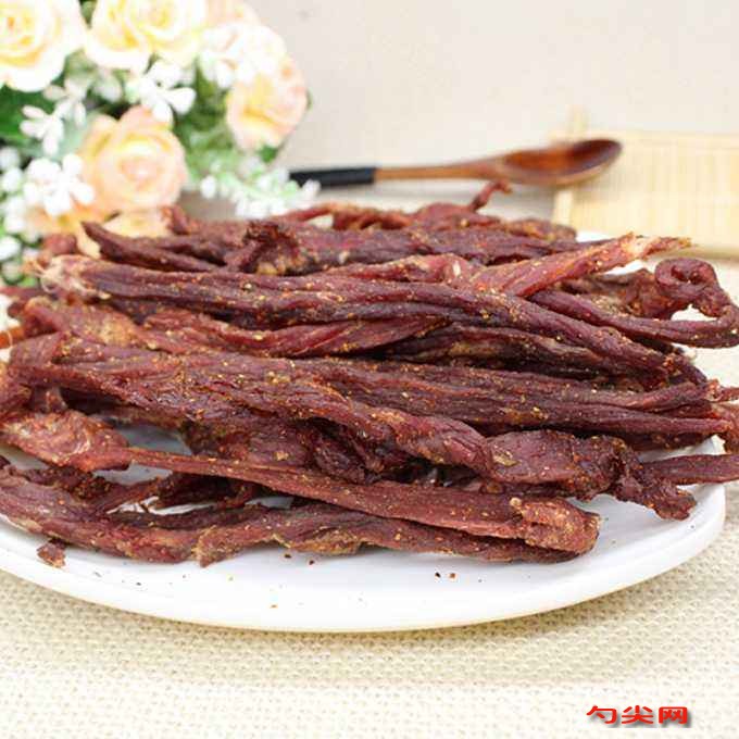 工藝:原料解凍→修整→腌漬→成型→熱加工→冷卻→包裝→入庫1.原料肉解凍。原料肉須放在干凈衛生的解凍池中解凍,牛肉應完全浸沒在流動的清水中,水溫控制在1-5℃,室溫控制在15℃以下,解凍視氣溫情況,必須完全解凍,要求肉中心無凍塊和硬塊。2.原料肉修整。剔除筋膜、腱、軟骨、淋巴、淤血、脂肪、污物等,再用清水沖洗表面血污,瀝干水分后備用。3.腌漬。把牛肉通過直徑10mm絞肉機絞制,將輔料加入,放入攪拌機里攪拌10分鐘,然后推入0-5℃冷藏間里,靜止腌漬12小時。如果要口感結實,就不需腌制,直接成型。4.成型。采用不銹鋼模具,將肉餡稱重后放入模具,擠壓成型后擺放在不銹鋼網架上,要求厚度0.8cm,寬度3cm,長度12cm。注意每片之間擺放整齊,不要互相擠壓,以免形狀不規則。5.熱加工。將半成品推入煙熏爐,關閉爐門,設定有關加工參數,干燥溫度55℃,時間60分鐘,烘烤溫度90℃,時間100分鐘,排氣3分鐘,出爐。6.冷卻。常溫下冷卻,1小時后推入包裝間,依設定重量真空包裝,貼標簽,打生產日期。7.入庫。