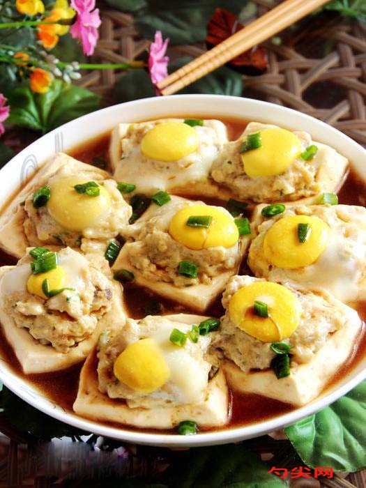 工藝:1、準備好原材料 2、魚肉去皮去魚刺 3、魚肉剁成蓉 4、蔥姜蒜切細 5、豆腐切成塊,將中間掏空 6、將豆腐放入鹽水里泡十幾分鐘 7、挖出來的豆腐捏碎放入魚肉里 8、加入蔥姜蒜末、少許料酒、味達蕾902號,生抽、蠔油、鹽、適量香油,攪拌均勻 9、將魚肉放入豆腐里 10、在每個魚蓉的中間淘一個小坑,打入鵪鶉蛋 11、放入鍋里蒸熟 12、鍋里放入少許油,倒入蒸好的魚肉釀豆腐盤子中的湯,加入少許生抽、蠔油、水淀粉撒上蔥花,淋上湯汁。