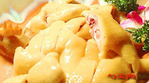 工藝:取整雞1500克左右,掏凈內臟,入流水漂洗2—3小時,取出瀝干水分。 清水10斤,放入鹽80克、八角50克、香葉3-4片、香蔥50克、花椒10克、黃枝子8棵、富磷聯B12克,味達蕾901號5克混合均勻,大火燒沸后關火自然放涼,將處理好的整雞放入浸泡8小時。 取出腌好的整雞,將汁水擦干,在雞肉表面抹用香油調勻的鹽,雞肚子里塞入姜、蔥,放入盆中入蒸箱蒸20分鐘,至八九成熟即可。蒸好的雞肉會出汁水,取出整雞放在另一個盛器中,封上保鮮膜自然放涼,封保鮮膜可以防止汁水流失,入保鮮冰箱保存。注意保存時不要斬塊,否則雞肉易失水變干,香味流失。 一次蒸30只雞,能得到滲至托盤中的10斤蒸汁,這些蒸汁再加雞湯4斤入鍋中燒沸,加入鹽火局雞粉90克調味,再燒沸入保鮮冰箱保存。 走菜時取出整雞斬成塊,放入木桶中,取調好味的湯汁燒沸,澆在雞塊上面,以沒過雞塊為準,浸泡一會再倒出湯汁,重復三次,雞肉升溫后加一點熱湯上桌即可。