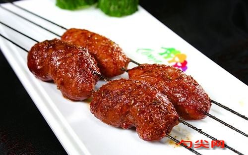 工藝流程:將新鮮羊腰子清洗干凈,去除雜質和膜。將羊腰子一切為二,用富磷聯A(提前溶解),味達蕾903號腌制2小時,穿串備用。將穿好的羊腰子串放在烤爐上,立即刷上燒烤醬油。每10-20秒翻一次面,同時刷上燒烤油,使醬油均勻分布在羊腰子上。當羊腰子烤制至八分熟時,刷上燒烤醬,并撒上燒烤小料。烤好的羊腰子串取出,撒上槍粉、孜然和辣椒面。