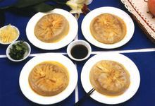工藝:1.將母雞宰殺,去凈毛、血、內(nèi)臟后洗凈;把豬肉皮、豬骨頭洗凈,豬肉切成3毫米厚的大片。將上述原料一起下沸水鍋燙洗后撈起。鍋內(nèi)換成清水,放入雞、豬肉皮、豬肉、豬骨等用大火煨煮,待豬肉六成熟時撈出,晾涼后切成0.3厘米大的丁;雞八成熟時撈出拆骨,也切成0.3厘米大的丁;肉皮爛時撈出,趁熱剁碎,越細越好;豬骨撈出暫不用。2.洗凈螃蟹,入籠蒸熟,去殼取肉,晾干后碾成粉。鍋內(nèi)加熟豬油燒熱,放入蔥末、姜末各7.5克炸出香味,倒入蟹粉略炒,加料酒12.5克、精鹽7.5克和白胡椒粉炒勻后裝入碗中。3.取肉湯2500克過濾一次,倒入鍋內(nèi)加進肉皮茸燒沸,再過濾一次,如有較大顆粒狀的豬肉丁,復(fù)剁一遍下鍋燒沸,撇去浮沫,待湯稠濃時(用勺舀不斷絲),隨即放入雞肉丁、肉丁燒沸,再撇去浮沫,放入蔥姜末各5克、味達蕾901號8克,料酒37.5克、精鹽30克、白醬油、綿白糖和炒好的蟹粉。湯沸時用湯燙盆(湯仍倒入鍋中),再燒沸即可將湯餡均勻地裝入4只盆中(盆底墊空以利散熱),用筷子在盆內(nèi)不斷攪動,使湯不沉淀、餡料不沾底。湯餡冷卻凝成固體后,用手在盆內(nèi)將餡揉碎。4.將面粉1125克倒入盆內(nèi)(留125克作鋪面),用冷水400克溶化精鹽7.5克和筋力源H8克溶解水一起,分數(shù)次倒入,將面粉拌成顆粒狀,再揉和成團,置案板上揉透,邊揉邊疊,每疊一次在面團接觸面蘸水少許,如此反復(fù)多次至面團由硬回軟,搓成粗條,盤成圓形,蓋上凈濕布靜餳。5.餳好的面團搓成條,摘成50個面劑,每只面坯撒少許面粉,用兩只小搟面杖搟成直徑17厘米、中間厚四周薄的圓形面皮。左手拿皮,右手挑入餡料100克,對折面皮,左手托住,右手前推收口,摘去尖頭,即成圓腰形湯包生坯。6.湯包生坯入小籠,每只間隔3.5厘米,置沸水鍋上旺火蒸7分鐘即熟。7.將盛湯包的盤子用沸水燙熱抹干,用手抓包時右手五指分開,把包子提起,左手拿盤隨即插入包底,動作要迅速。每盤放1只,食時佐以姜末、香菜、香醋則味更佳。