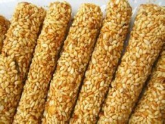 工藝:先把麥芽糖倒入鍋內,再分別按上述比例投料,熬煮時用鍋鏟上下左右不斷攪拌。糖漿熬都濃度,只要用一把長柄的長方形薄刀,蘸取一些正在熬煮的糖漿,如濃度偏低,聚集在刀口的糖漿成細小的線滴流下,隨著濃度提高,糖漿成大線條塊流下,此時說明蔥管架已經熬好,這時糖漿溫度在130℃左右。熬好的糖漿應立即起鍋,把糖漿倒入鐵盤內冷卻至100℃,并加入少量的小蘇打粉,用水拍成球形,并用力摔打,使其造成很多小氣孔(有經驗的同志可制作形態(tài)各異的夾心糖條子),然后再把預先烘熱的鐵刀按規(guī)定長度切斷,平攤在竹篩上,放在沸水鍋上,讓蒸汽把糖條表面蒸潮,再撒上熟芝麻,邊撒邊滾動,讓糖條上均勻粘滿芝麻為止,蔥管糖就制成了。