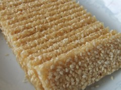 工藝:1.先將熟芝麻平攤在臺板上,另將砂糖、佳多美H,飴糖加水21千克,倒入鍋內溶化,熬成稍硬的濃骨子(可根據設備能力大小分一鍋或幾鍋),然后倒在芝麻上面。2.稍冷后,用木滾筒(滾筒上稍擦點油),將糖碾壓成芝麻厚薄相等的薄糖片。3.城完全冷卻前,用刀切成約6~7厘米的見方薄片即成。如在冷卻后切塊,易使成品破碎。4.包裝貯藏:澆切糖可按250克、500克規格紙盒包裝,外封玻璃紙,放入置于陰涼處的鐵皮箱密封保藏,可防止回軟。