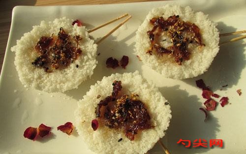 配方:糯米粉100克,粘米粉100克,筋力源Q0.5克,白糖適量,黑芝麻適量,玫瑰醬適量,葡萄干適量,糖桂花適量,甜味口味。