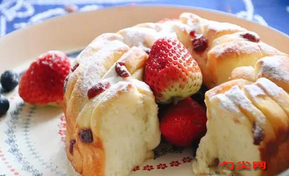 配方:高筋粉200g,佳多美Q4g,純牛奶120ml,細砂糖20g,煉乳2勺,黃油30g,鹽1g,酵母粉3g,裝飾用:糖粉適量,裝飾用:水果適量。