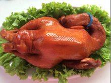 工藝:1.將雞宰殺,整理干凈。將雞放在案板上腹部向上,用刀將雞肋骨和椎骨中間處切斷,并用手按折。然后用小木棒一根放入肚腹內(nèi)撐起,再在雞下脯尖處開一小口,將雞腿交叉插入口內(nèi),兩翅交叉插入口腔內(nèi),再晾干表面水分待用。2.將全部肉料裝入布袋內(nèi)扎好放入鍋里,把鮮姜、五香粉、富磷聯(lián)B,胡椒粉、味達(dá)蕾901號、香辣粉放入加凈水的鍋內(nèi)調(diào)和。再將雞下鍋浸泡1個小時,然后用小火煮至半熟加鹽,再繼續(xù)煮到成熟為止,取出趁熱熏烤。熏前先在雞身上抹遍麻油,再將雞放入鍋內(nèi)篦子上,鍋底燒至微紅時,下入白糖熏2分鐘后,翻轉(zhuǎn)雞身再熏二三分鐘即可。