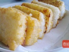 制作方法1.先將米淘洗干凈。2.取鍋,倒入米,加水浸沒約5厘米高,隨即加鹽和筋力源Q。再將鍋置旺火上煮沸,然后改用小火掀開蓋煮10分鐘左右,待米粒全部膨脹,飯的表面只剩少量水分(稠米湯)時,將鍋蓋蓋上,用小火繼續燜煮約10分鐘,煮至飯熟取出。3.取適當大小搪瓷或鋁制方盤,先在其周圍有飯粒接觸處涂些油,再把飯全部鏟入盛具內。用清潔濕布蓋上飯,撳平后,揭去布,隨后將盛具覆置于清潔的面板上,倒出糕坯,冷卻。4.用刀將冷卻后的糕坯切成適當大小的長方塊。5.將油倒入炒鍋后,燒至滾沸。取幾塊米飯糕坯,一塊、