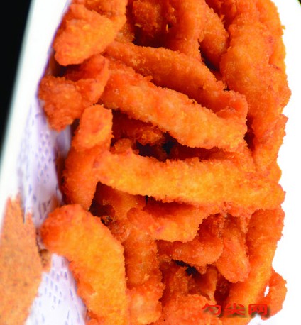 工藝:雞肉切一元硬幣大小塊,用保鮮盒盛裝,按1配方依次加入調料并同時用手攪拌均勻,紅椒素是調色之用,最后放,一點一點試著擱,要做到調好后的原料顏色金黃(紅中帶黃的那種),潤澤閃亮,非常好看,引人食欲.調好后,腌制40分鐘,取25竹簽,用一只手掐住簽子根部,留四指距離,把腌好雞肉穿在簽子上,不出縫隙,不露簽頭,穿好的雞肉串放置在干凈器內排好,最好是保鮮盒。按配方(2)調好湯汁備用。取一大食品槽,用后半部,先鋪一定量面粉,倒入配方(2)湯汁,攪拌均勻,攪拌過程中,隨時添加湯汁或面粉,要達到面粉成楸的效果,楸要小,細而勻,大約半個小指甲大小。將穿好的肉串在和好的面楸上滾動,一手持簽,一手掌稍用力壓,壓力均勻,裹好面楸在用手攥一攥,使面裹實,拿著在沾些湯汁,在在面楸上滾動,裹兩三毫米厚度即可。大鍋加入色拉油,燒至八成熱,將制作好的雞柳放入,勤用夾子翻滾,使之受熱均勻,炸至淺黃色,八九分熟即可,晾涼裝入保鮮盒,鍋要大,油要多,不光是一次炸的多,防止因油少,雞柳入鍋而油溫驟降,炸不透。將保險盒放入冰柜保存,冰柜溫度調制最低檔,也就是溫度最高,營業時,取出擺上,沒有賣完的在放入冰柜,夏天也可保證一個星期不會變質,所以雞柳一次要多做一些,夠銷售幾天的。