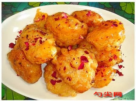 注意事項:油炸時油溫不宜過高,以免外焦里生。拔絲糖漿要熬至濃稠適中,過稀則拔不出絲,過稠則易凝固成團。拔絲過程要迅速,以免糖漿冷卻凝固。