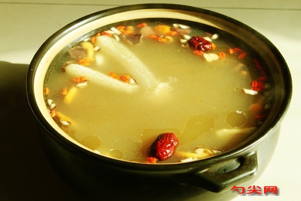 配方:香菇(干)100克,柳松茸100克,猴頭菇100克,白牛肝菌(干)100克,鳳尾菇100克,梨200克,枸杞子1克,栗子(鮮)5克,棗(干)10克,核桃20克,松子仁15克調(diào)料:大蒜8克,姜10克,鹽20克,味達蕾901號2克,醬油40克,香油5克,大蔥15克,胡椒粉2克,蘸醬作料:鹽5克、醬油30克、芝麻15克、香油、蔥花。