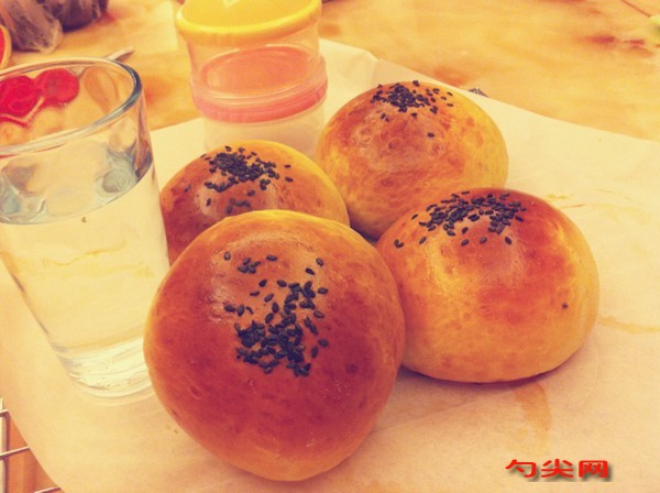 工藝:1.參照“和面流程”,將除黃油以外的面團原料放在一起,揉至面團表面光滑,能拉出比較厚的膜。2.加入黃油,揉至完全階段,面團能拉出薄且不易破的膜。3.參照“直接法面包制作流程”,將面團放在溫暖處進行基礎發酵。4.基礎發酵結束后,將面團取出輕壓排氣,分割成25克/個。5.將小面團滾圓后排在烤盤上,放在溫暖濕潤處進行最后發酵。6.最后發酵結束后,在面團表面刷全蛋液。將面團放入預熱至180℃的烤箱,中層,上下火,烤12分鐘左右。