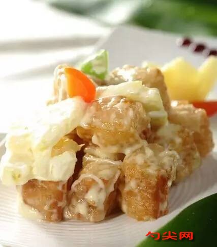 4. 鍋中油再次燒至滾熱,將炸好的油條蝦倒入繼續(xù)復(fù)炸至香脆控油撈出,待涼后和菠蘿、沙拉醬一起拌勻,灑上黑芝麻即可。