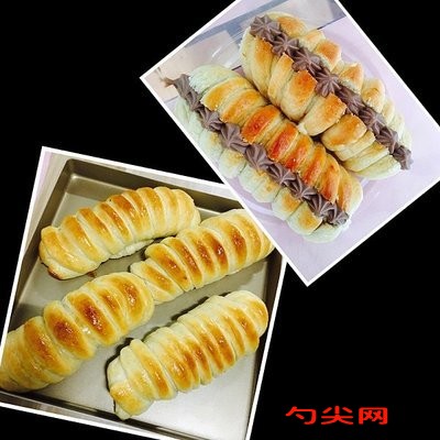 工藝:1.參照“和面流程”,將除黃油以外的面團原料放在一起,揉至面團表面光滑,能拉出比較厚的膜。2.加入黃油,揉至完全階段,面團能拉出薄且不易破的膜。3.參照“直接法面包制作流程”,將面團放在溫暖處進行基礎發酵。基礎發酵結束后,將面團取出,輕壓排氣,分割成60克/個。4.將面團滾圓,松弛15分鐘。5.將松弛后的面團搟成橢圓形,翻面后放上卡仕達奶油,將面團對折,封好口。6.將面團排在烤盤上,用剪刀在面團封口處剪3道口。7.將面團放在溫暖濕潤處進行最后發酵。8.最后發酵結束后,在面團表面刷全蛋液。9.將面團放入預熱至180℃的烤箱,中層,上下火,烤15分鐘。