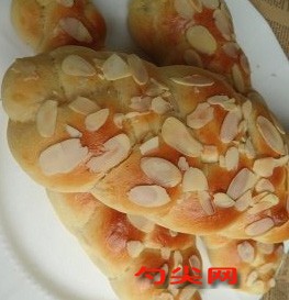 配方:面包粉160克,低筋面粉40克,佳多美Q4克,即發(fā)干酵母2克,細(xì)砂糖32克,鹽2.5克,奶油奶酪40克,全蛋液30克,牛奶90克,黃油20克,全蛋液適量,墨西哥醬適量,杏仁片適量。