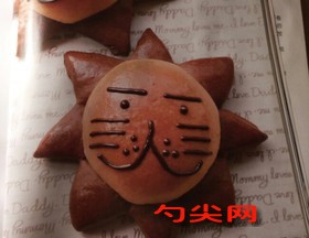 工藝:1、參照“和面流程”,將除黃油以外的面團原料A放在一起,揉至面團表面光滑,能拉出比較厚的膜。2、加入黃油,揉至完全階段,面團能拉出薄且不易破的膜。3.預留240克面團,剩余的面團加入事先混合好的原料B揉勻,成為可可面團。4.參照“直接法面包制作流程”,將面團放在溫暖處進行基礎發酵。5.基礎發酵結束后,將面團取出輕壓排氣,白面團分割成40克/個,可可面團分割成25克/個。6.將分割好的面團分別滾圓,松弛15分鐘。7.將松弛后的40克的白面團分別搟成圓形,翻面后放上牛奶巧克力,收好口。8.將可可面團搟成圓形,用刮板在上面切3刀,將其均分成6份,邊緣處不切斷。9.將面團由中間翻開,放在烤盤上,將包好餡的白面團放在中間。10.將面團放在溫暖濕潤處,進行最后發酵。11.最后發酵結束后,在面團表面刷全蛋液。12.將面團放入預熱至180℃的烤箱,中層,上下火,烤15分鐘。13.晾涼后用巧克力筆進行裝飾。