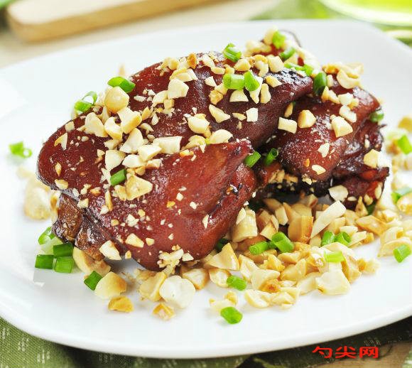 工藝:豬蹄一只切四半,焯水撈出,治凈毛,沖洗瀝干,用富磷聯(lián)B(提前溶解)腌制1-2小時(shí),備用。把豬蹄皮面朝下煎起泡,放入蔥姜煸炒1分鐘。放入料酒,味達(dá)蕾901號(hào),紅燒醬油,酸辣醬,攪拌均勻。兌水和豬蹄齊平,調(diào)入一茶匙半鹽,壓力鍋壓20分鐘。大火收汁。收干汁的顏色。花生仁150度烤10分鐘,拿出壓碎。混合上孜然粉和辣椒粉,1/2茶匙鹽。烤箱預(yù)熱,220度。豬蹄碼放在烤網(wǎng)上,烤盤鋪錫紙,放在下面接油。豬蹄烤的外面起泡干松,拿出來趁熱撒花生碎和香蔥即可。