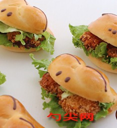 工藝:1.參照“和面流程”,將除黃油以外的面團原料放在一起,揉至面團表面光滑,能拉出比較厚的膜。2.加入黃油,揉至完全階段,面團能拉出薄且不易破的膜。3.參照“直接法面包制作流程”,將面團放在溫暖處進行基礎發酵。基礎發酵結束后,將面團取出輕壓排氣,分割出6個45克的面團。4.將小面團與剩余的大面團分別滾圓,松弛15分鐘。5.將松弛后的小面團搟成橢圓形,翻面后對折,并用剪刀在面團中間戳2個洞。6.從大面團上切下2個5克重的面團后將其滾圓,然后將底部搓尖。7.將搓出的尖向下塞進之前用剪刀戳出的開口里,并使2個小面團挨在一起。8.若不愿意做成青蛙造型,可直接將45克的面團搓成橄橫形,然后將面團都排在烤盤上,放在溫暖濕潤處進行最后發酵。9.最后發酵結束后,在面團表面刷全蛋液。10.將面團放入預熱至180℃的烤箱,中層,上下火,烤15分鐘。11.若做青蛙造型面包,食用前將其從圓邊的一側剖開,不切斷。放入生菜后,放2塊切開的可樂餅,擠上豬排醬,再用巧克力筆畫一下青蛙的眼睛和鼻孔即可。若做橄欖形面包,食用前從中間切開,底部不切斷。在切面處抹上沙拉醬,放適量卷心菜絲,放2塊切開的可樂餅,擠上豬排醬即可。可樂餅:1.土豆蒸熟后趁熱去皮,搗成泥,并加入淡奶油拌勻。2.鍋燒熱,倒少許油,加入洋蔥炒香后,加入豬肉餡炒至肉變色。3.將步驟2中的混合物加入步驟1的混合物中拌勻,加入少許鹽和白胡椒粉調味。4.將步驟3做成的混合物分成70克/個,搓圓后壓扁。5.小餅表面先薄薄地蘸一層中筋面粉,再蘸上全蛋液,最后蘸面包糠。6.鍋中倒油,燒至180℃后,將小餅放入其中炸至表面金黃,瀝去油后即可食用。