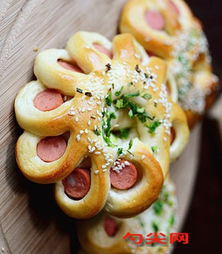 工藝:1.參照“液種面包制作流程”,將除黃油以外的面團原料放在一起,揉至面團表面光滑,能拉出比較厚的膜。2.加入黃油,揉至完全階段,面團能拉出薄且不易破的膜。將面團放在溫暖處進行基礎3.基礎發酵結束后,將面團取出輕壓排氣,分割成70克/個。4.將面團滾圓,松弛15分鐘。5.將面團搟成橢圓形,翻面拉出四角,整理成長方形,壓薄長底邊。6.放上火腿腸,自上而下卷起來。7.在面團上均勻切7刀,頂部不切斷。8.將面團展開,整理成環形,排在烤盤上。9.將面團放在溫暖濕潤處進行最后發酵。10.最后發酵快結束時,將表面裝飾原料B中的香蔥末和全蛋液放在一起拌勻。11.最后發酵結束后,在面團表面刷全蛋液。12.在步驟10的混合物里加入鹽拌勻,放在發好的面團上。13.將面團放入預熱至180℃的烤箱,中層,上下火,烤15分鐘。