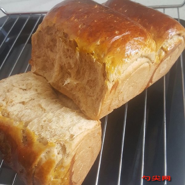 工藝:1.參照“中種面包制作流程”,將中種原料里的酵母放在牛奶里化開后,加入面包粉揉勻,放在溫暖處發(fā)酵至原來(lái)的4倍大。2.將發(fā)好的中種切成小塊,與除黃油以外的主面團(tuán)原料放在一起,揉至表面光滑,能拉出比較厚的膜。3.加入黃油,揉至完全階段,面團(tuán)能拉出薄且不易破的膜。將面團(tuán)放溫暖處松弛30分鐘4.將面團(tuán)取出輕壓排氣,均勻分割成3份。5.將面團(tuán)滾圓,松弛15分鐘。6.將松弛后的面團(tuán)兩側(cè)向內(nèi)收窄,自中間向兩頭搟成橢圓形,翻面后壓薄短底邊,自上而下卷起來(lái)。7.將面團(tuán)松弛10分鐘。8.將面團(tuán)自中間向兩頭搟長(zhǎng),翻面后壓薄短底邊,自上而下卷起來(lái)。9.將面團(tuán)放入吐司模中,在溫暖濕潤(rùn)處進(jìn)行最后發(fā)酵。10.最后發(fā)酵結(jié)束后,表面刷全蛋液。11.將面團(tuán)放入預(yù)熱至180℃的烤箱,下層,上下火,烤35分鐘。12.出爐后將模具在案板上使勁磕一下,將吐司取出,放在烤網(wǎng)上晾涼。