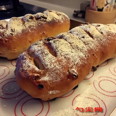 工藝:1.參照“中種面包制作流程”,將中種原料里的酵母放在水里化開后,加入面包粉揉勻,放溫暖處發酵至原來的約4倍大。2.將中種切成小塊,與除黃油以外的主面團原料放在一起,揉至面團表面光滑,能拉出比較厚的膜。3.加入黃油,揉至擴展階段,面團能拉出比較薄且不易破的膜,分割出90克面團,將2個面團分別放溫暖處松弛30分鐘。4.將松弛后的2個面團各平均分割成2份,滾圓,蓋保鮮膜,松弛15分鐘。5.面團松弛時,開始制造蒸汽的操作:取一烤盤盛滿石子,放在烤箱上層,以230℃預熱烤箱。6.將松弛后的大面團收口朝上,光滑面朝下,搟成圓形,翻面后放上血糯米核桃餡,收好口。7.將小面團搟成橢圓形,翻面后壓薄長底邊,自上而下卷起來,然后搓成長條。8.將包好餡的面團壓在長條面團上,再把長條面團兩邊交叉,將兩頭壓在底部。9.將面團排在鋪好烘焙紙的另一烤盤上,蓋上保鮮膜,放在溫暖處進行最后發酵。10.最后發酵大約30分鐘,至原來的約2倍大后,在面團中間篩黑麥粉裝飾。11.將面團移至預熱好的石板上,立即往烤盤上倒約300毫升開水,并迅速關上烤箱門。12.5分鐘后撤去盛石子的烤盤,轉200℃,繼續烘烤約15分鐘。13.出爐后將面包移至烤網上晾涼。餡:1.將血糯米淘洗干凈,浸泡2小時。2.加入適量水,做成米飯后加入細砂糖拌勻。3.晾涼后,再加入適量核桃仁拌勻即可。
