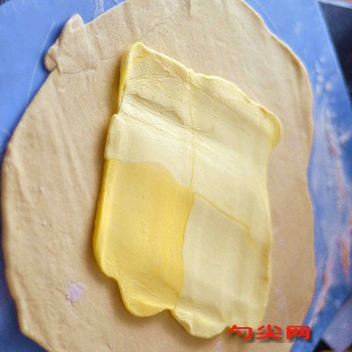 工藝:1.將除黃油以外的面團原料放在一起,揉至面團表面光滑,能拉出比較厚的膜。2.加入黃油,揉至完全階段,此時的面團能拉出薄且不易破的膜。3.將面團放入保鮮袋中,壓扁,放入冰箱,冷凍30分鐘。4.準備裹黃油前,將片狀黃油切出需要的分量,壓成長方形。5.將冷凍后的面團搟成黃油2倍大的長方形。6.將壓成長方形的片狀黃油放于其上。將面團的兩端折上來,捏緊接口處。7.將面團沿長邊排長,自左、右各1/3處向內折,完成一次三折。8.將面團順折邊所在的方向拼長,自兩端各1/3處向內折,完成第二次三折。9.將面團放在保鮮袋中,放入冷藏室,冷藏30~60分鐘。10.將冷藏松弛后的面團順折邊所在的方向搟長,自左、右各1/3處向內折,完成第三次三折。11.將面團放在保鮮袋中,放入冷藏室,冷藏30~60分鐘。12.將冷藏松弛后的面團按拼至需要的厚度即可分割、造型。