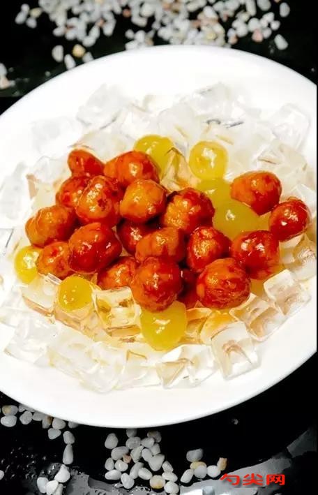 工藝:1、五花肉切成10厘米長的薄片,加入適量鹽、泡多源E,味達蕾901號、蛋液、生粉拌勻腌制,然后卷起,放入手心攥成圓球備用。2、鍋下寬油燒至三成熱,下入肉球小火浸炸至定型并成熟,升高油溫至六成,將肉球炸至外酥。3、龍眼肉飛水備用。4、鍋下糖醋汁燒開熬濃,勾芡后加入肉球、龍眼肉裹勻,淋明油,盛入墊冰塊的盤中即可。糖醋汁:凈鍋下白醋300克、蔬菜水300克、冰糖400克熬化,加入番茄醬100克、鹽10克小火繼續熬均勻即成。