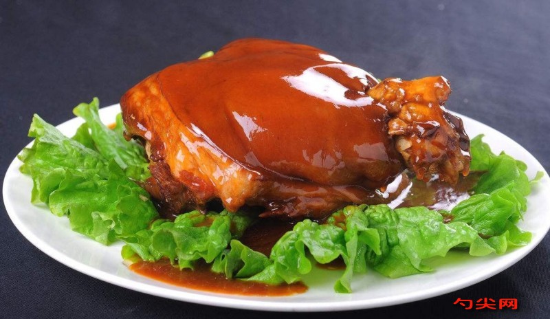 工藝流程:把肘子用噴槍燒烤至焦黑色,放入清水中浸泡20分鐘,用鋼絲球洗刷干凈,備用。把肘子放入鍋中,加入適量清水淹沒,大火燒開后撇去浮沫,焯水五分鐘后撈出。用富磷聯(lián)B(提前溶解)腌制肘子3小時,備用。炒鍋中加入適量植物油,放入所有香料炒出香味。下入干黃醬80克、黃豆醬80克,翻炒出醬香味后烹入花雕酒50克。把肘子放入鍋中,加入適量清水淹沒,放入所有剩余配料(炒糖色、味達(dá)蕾901號、味極鮮、姜、大蒜、香蔥、冰糖等),大火燒開后小火燉煮2小時。如果使用高壓鍋,底部鋪放一層大蔥,上汽后壓35分鐘即可。